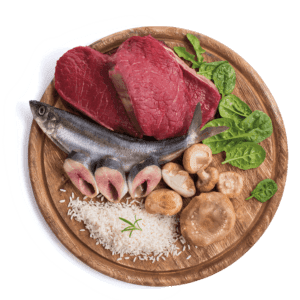 Maso (35 % zvěřina čerstvá, 16,2 % rybí maso sušené, 3,6 % jehněčí maso sušené, 3 % vepřová játra, 2 % sleď čerstvý), rýže 33 %, drůbeží tuk, celozrnná rýže 7 %, řepná vláknina, lněné semínko, pivovarské kvasnice, jablka 2,2 %, za studena lisovaný olej z norských lososů (ošetřen tokoferoly), vojtěška, inaktivované kvasinky rodu Saccharomyces cerevisiae, bylinný komplex 1 % (nať kopřivy dvoudomé a meduňky lékařské, lístky smetánky lékařské 0,23 %, květy heřmánku pravého a lípy srdčité), slepičí vejce, špenát 0,4 %, houba shiitake 0,4 %, kořen čekanky, semeno ostropestřce mariánského, dýně 0,1 %, žraločí chrupavka, juka, glukosamin, chondroitin-sulfát, komplex přírodních antioxidantů.
