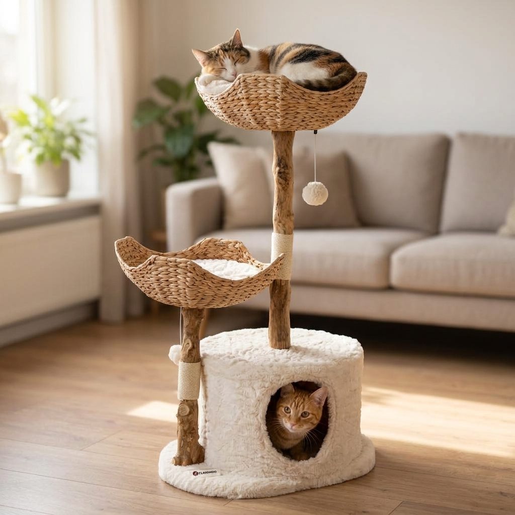 Dopřejte své kočce luxusní odpočinek s škrabadlem Flamingo Hector! Vyrobeno z dřeva kávovníku a měkkého plyše (510 g/m²), s jutovým lanem, polstrovanými plošinami a hračkami pro nekonečnou zábavu. Ideální místo pro hraní i lenošení.