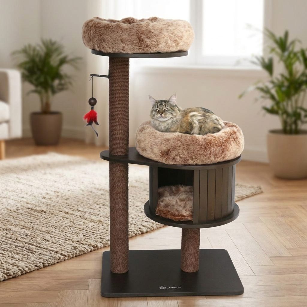 Flamingo Raisa 1 Brown je škrabadlo, které vaší kočce poskytne hodiny zábavy. Vybaveno papírovým škrabacím lanem (6 mm) a hračkou pro ještě větší zábavu. Plošiny a úkryt mají odnímatelné polštáře potažené měkkým plyšem pro pohodlný odpočinek.