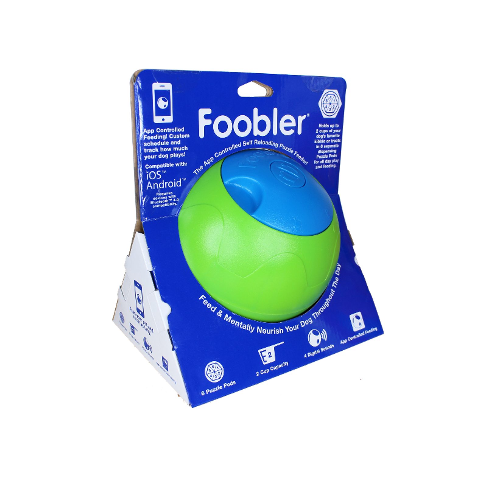 Foobler je automatickýdávkovač krmiva v úžasném provedení interaktivní hračky. Také chcete zlepšit krmení vašeho mazlíčka zábavnou hrou? Samopohyblivý míček plný nejen zábavy ovládáte dokonce přes váš smartphone! Přehlednou aplikaci Foobler stahujte pro iOs i Android (4,3 a výše). Foobler funguje na 2 ks AA baterií (nejsou součástí balení).