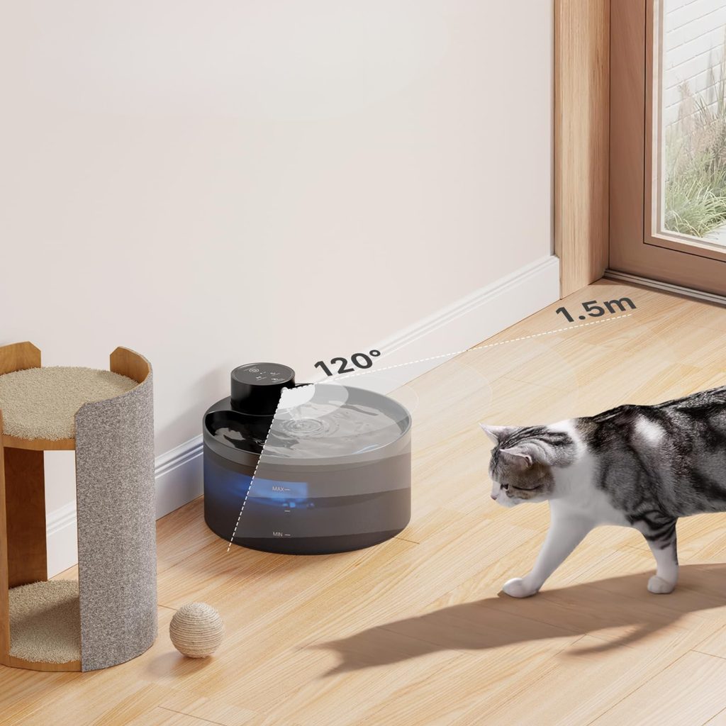 Fontána aktivuje tok vody, když se kočka přiblíží, díky 120° senzoru s dosahem 1,5 m. Můžete zvolit režim pití, který vaší kočce nejvíce vyhovuje, což podporuje zdravé návyky pití.